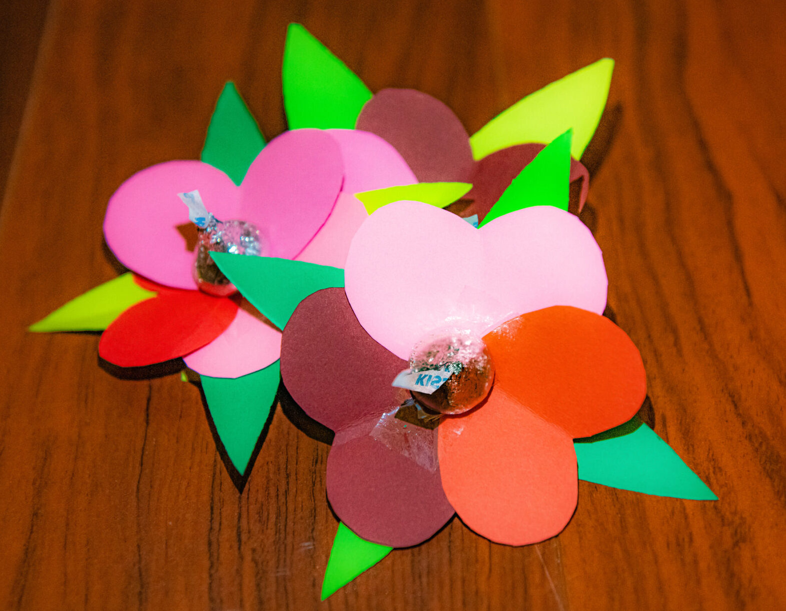 Tape the chocolate kiss in the center of the flowers.