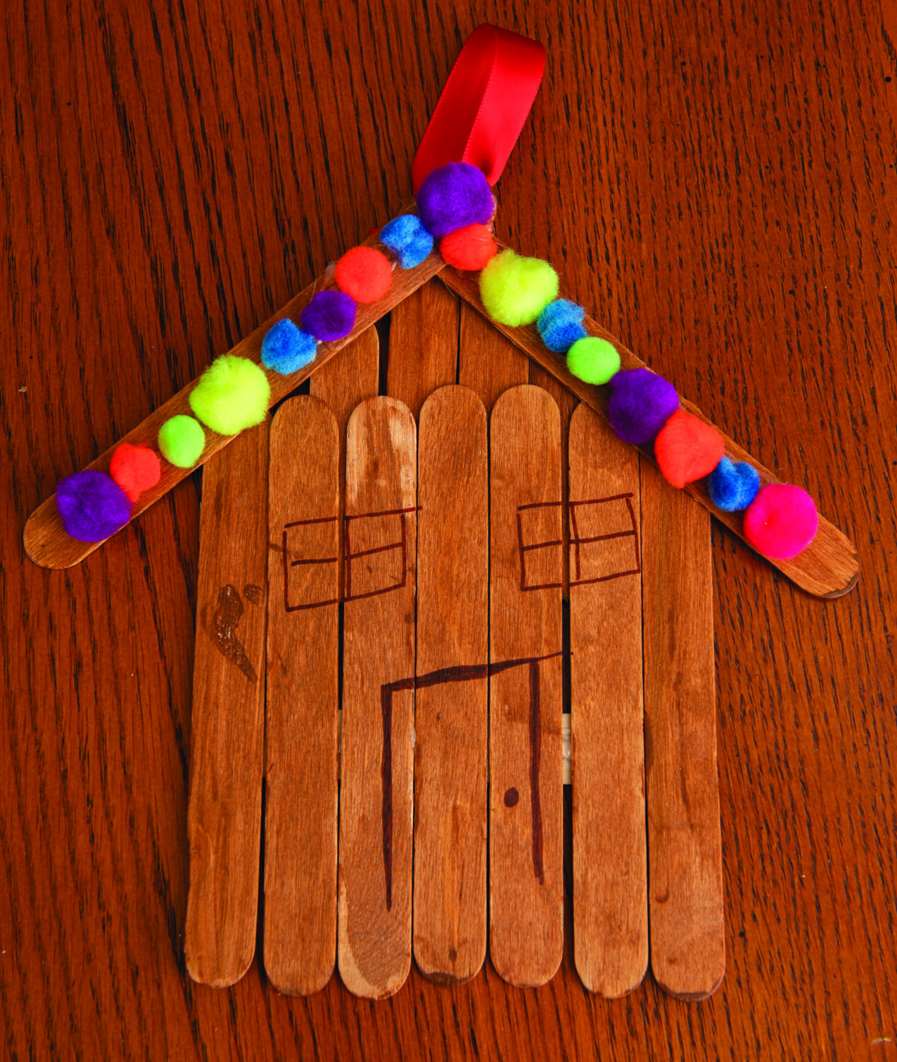 Loop a red ribbon and glue to the top of the cabin.