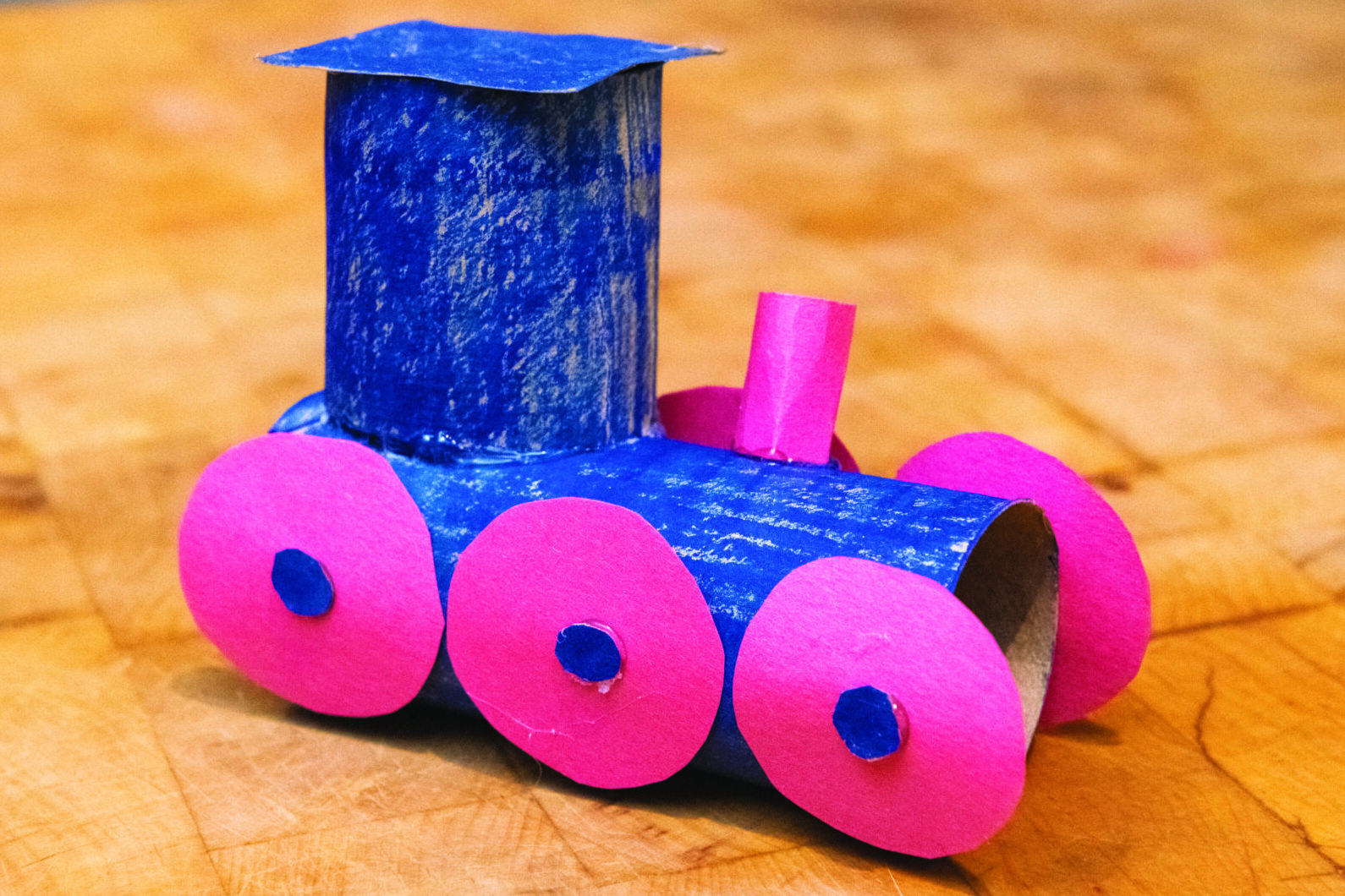 Cut smaller circles out of the blue construction paper for the center of the wheels.