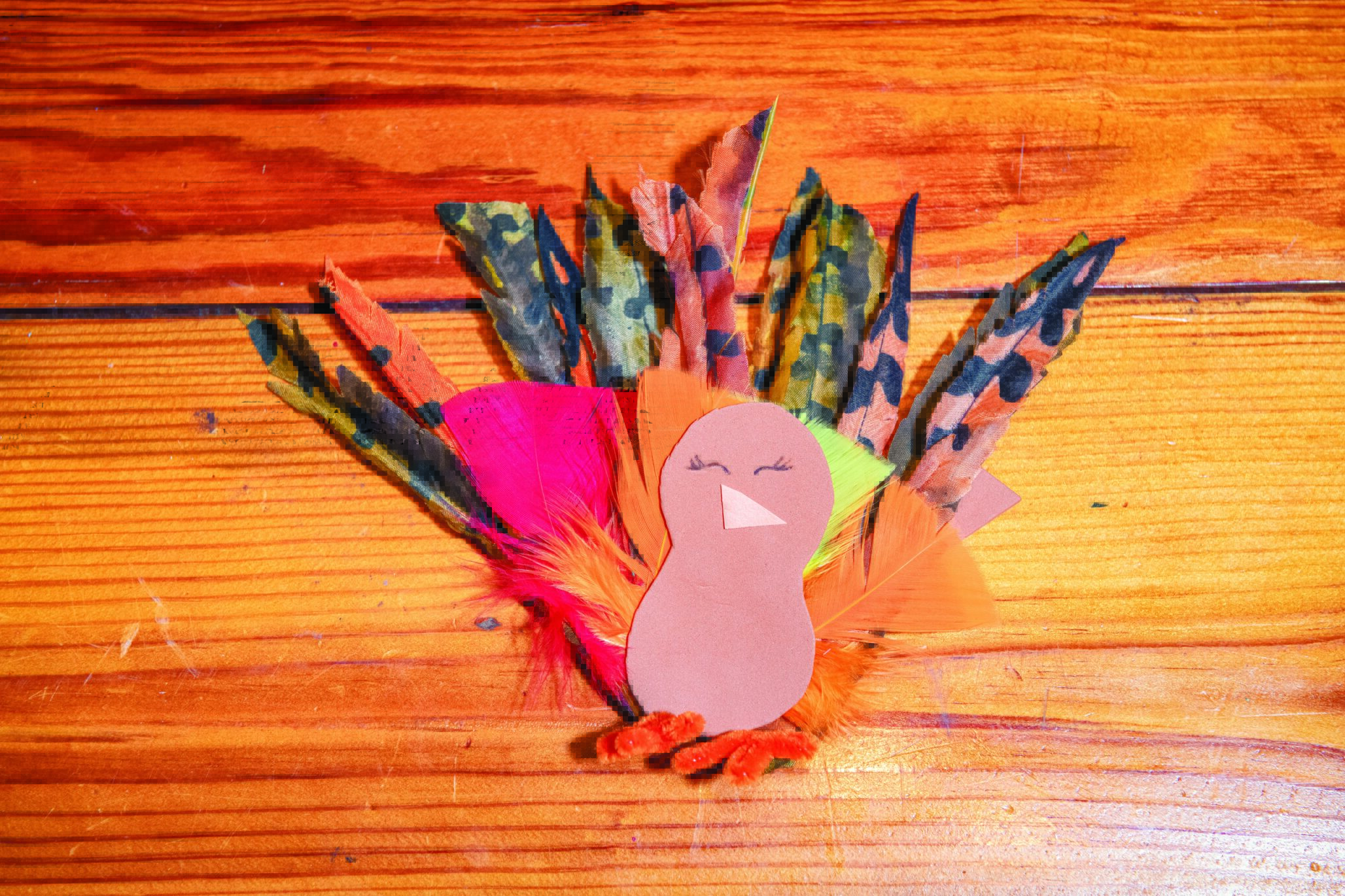 Cut the dark brown construction paper into a fan-shape (for the tail feather base) and a peanut shape (for the turkeys body). Glue the longer feathers to the fan shaped base. Glue the shorter feathers on top of the longer feathers. Cut a breakout of the light brown construction paper and glue to the body. Draw eyes on the turkey. Take the orange pipe stems and twist them into feet for the turkey. Glue the pipe stem feet to the bottom of the fan base at the bottom of the turkey body.