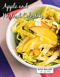 In a large mixing bowl, combine the shredded cabbage, sliced apples and chopped walnuts.
