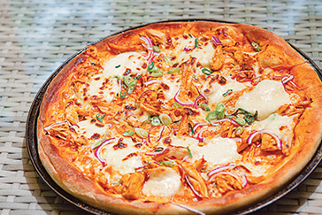 Add remaining buffalo sauce to the pizza and spread over dough leaving outer 1-inch bare.
