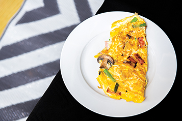 Use a silicone spatula to carefully fold the edges of the omelet while tilting the pan, allowing the eggs to cover the entire surface of the pan.