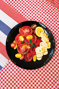 Brush the grill grates with oil, then add the halloumi and cook, turning once, until marks appear and the cheese is warmed throughout, about 1 minute per side.